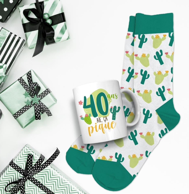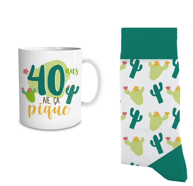Le coffret cadeau d'anniversaire 40 ans est pour homme et contient deux cadeaux. Il est présenté dans une boîte en carton kraft avec un couvercle transparent et il est fermé avec un adhésif coloré. A l'intérieur, vous trouverez un mug blanc décoré avec une inscription "40 ans, ça pique !" qui est entourée de deux cactus, ainsi qu'une paire de chaussettes. Les chaussettes sont assorties au mug, elles sont bleues/vertes, décorées avec des cactus (la taille est 39/45).