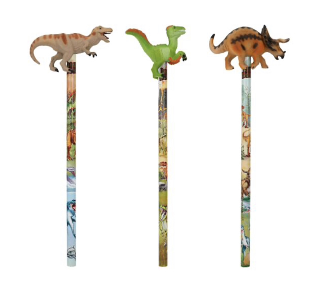 Dino-tastique ! Les crayons à papier Dino World avec de super motifs et des embouts dinosaures (vélociraptor, T. rex, tricératops) ont un diamètre de 7 mm et sont équipés d'une mine HB.