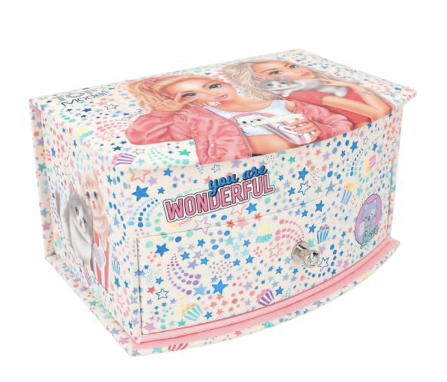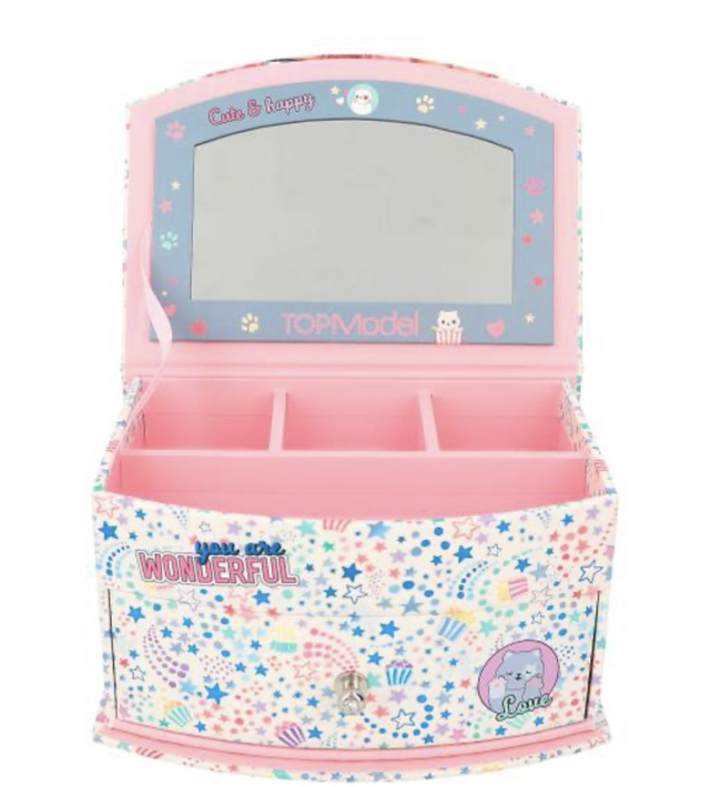 Pour tes objets précieux : la petite boîte à bijoux TOPModel Cutie Star avec un mignon imprimé all-over étoiles, des symboles popcorn drôles, d'adorables chatons et un imprimé stylé mannequin cache un miroir dans son couvercle à charnière et dispose d'un compartiment principal subdivisé, ainsi que d'un grand tiroir avec un strass sur son bouton.