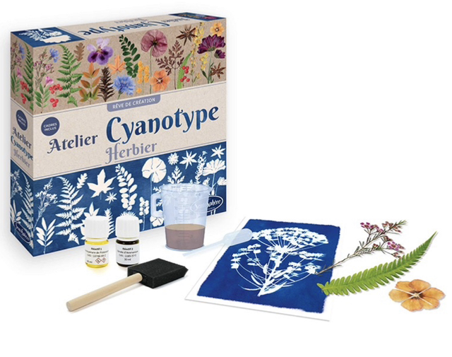Ce procédé photographique se réalise avec un mélange qui réagit à la lumière et fait apparaître les zones exposées en bleu de Prusse. Tu peux utiliser les caches adhésifs fournis pour tes créations, ou créer de jolis tableaux avec des fleurs et des feuilles séchées. Les 2 cadres fournis te permettront d'exposer tes plus belles réalisations !